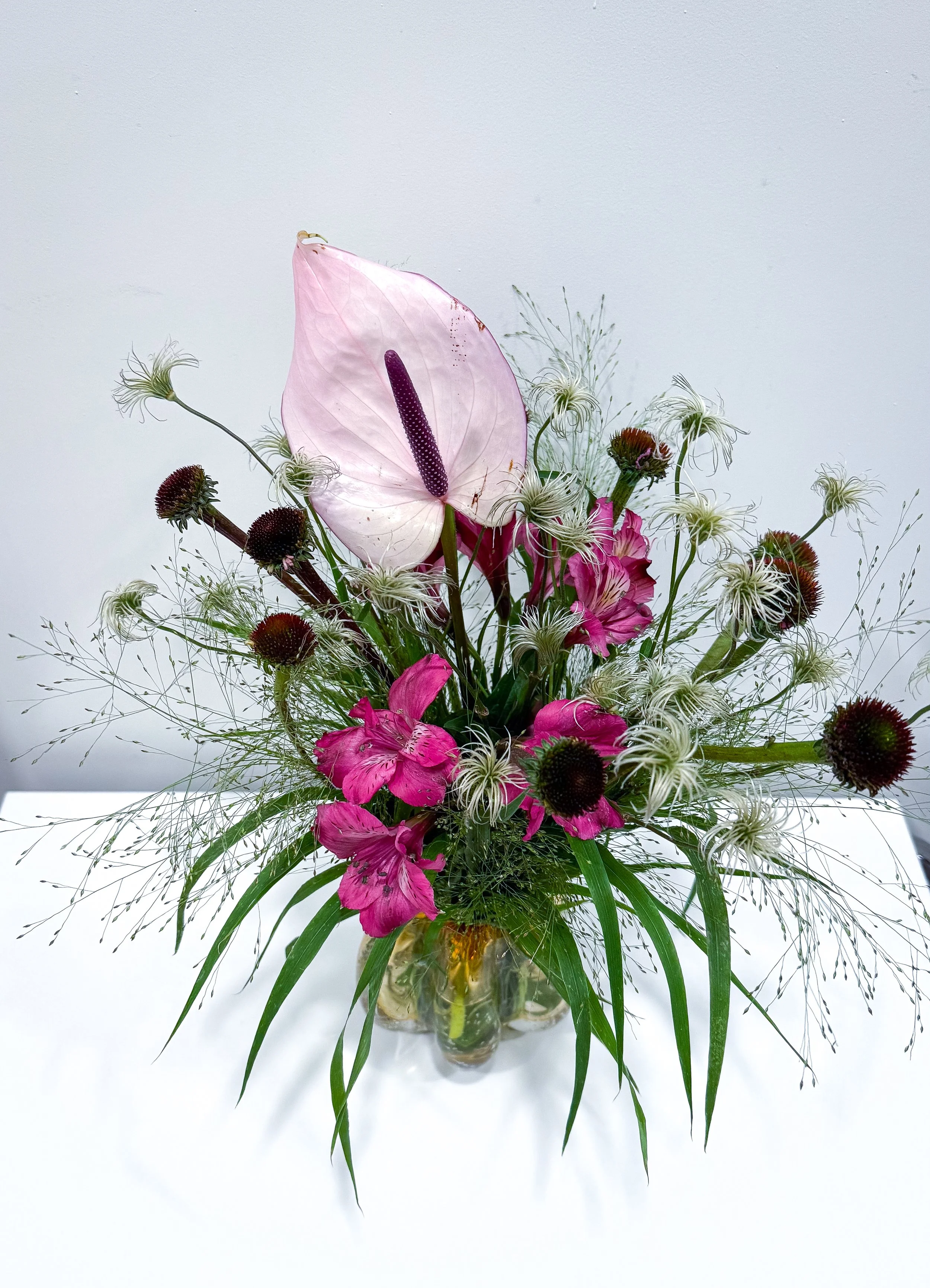 On display: Clematis, Echinacea Thistle, Peruvian Lily, Anthurium